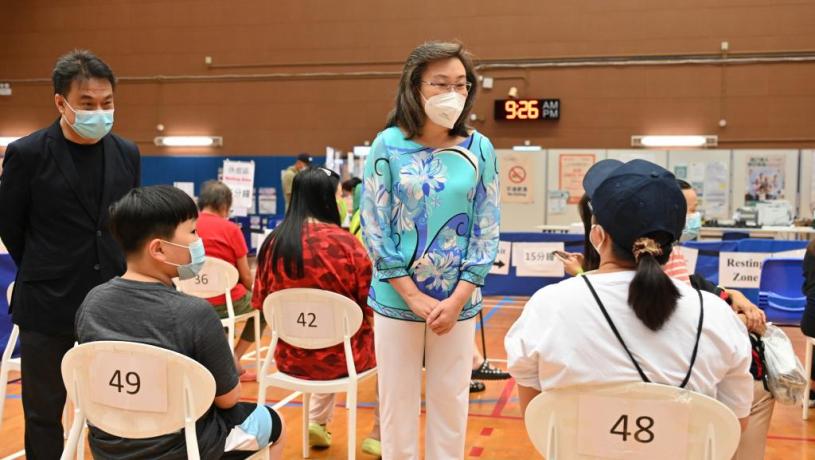 公務員事務局局長楊何蓓茵今日上午到新冠疫苗接種計劃中央指揮中心和官涌體育館社區疫苗接種中心,視察社區疫苗接種中心在颱風襲港後恢復運作的情況及疫苗接種安排。