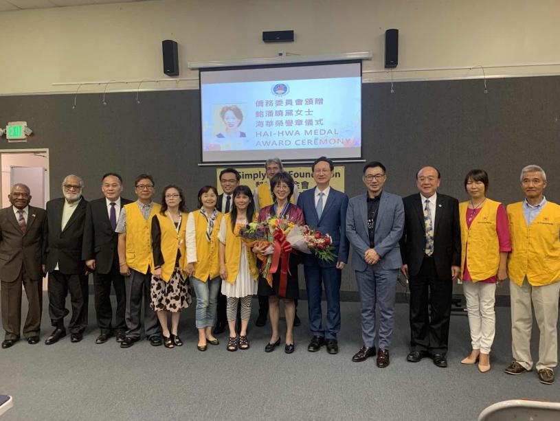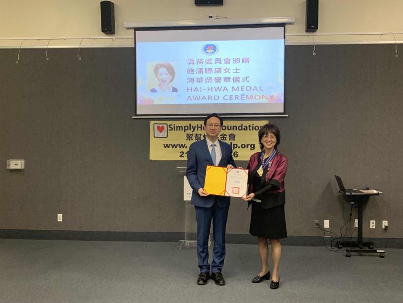 台灣的僑務委員會委員長童振源博士蒞臨洛杉磯訪問僑社,頒發「海華榮譽章」給「幫幫忙基金會」創辦人鮑潘曉黛,表彰她長期在海外協助推動僑務工作、公眾外交、國際交流等事務。
