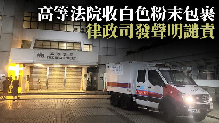 高等法院收到一個裝有可疑粉末的包裹。傍晚6時許,金鐘高等法院二樓有職員接獲一個包裹,打開後發現內有一個裝有白色粉末的罐,於是報警求助。爆炸品處理課人員隨即到場處理,相信該些粉末沒有危險成份,事件中沒有人受傷,毋須疏散。警方已檢走有關粉末作進一步檢驗。經初步調查,案件列作求警協助,交由中區警區刑事調查隊第五隊跟進,暫未有人被捕。