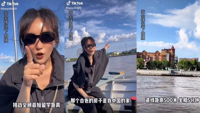 影片顯示,一名女子站在一條船上,指著岸上一棟白色建築稱,那是自己中國的家。鏡頭一轉,她又指著江對面一棟紅色俄式建築稱,那就是自己俄羅斯留學的學校,直線距離約500米,坐船約5分鐘,並稱「挑戰全網最短留學距離」。這段影片在網上引發熱議,有網民稱,家裡的Wi-Fi都可以連上學校。也有網民戲言:「努力可以回家睡個午覺。」