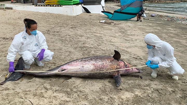 香港海洋公園保育基金昨日(6日)接報,指貝澳泳灘有鯨豚擱淺個案,人員隨即趕往調查,證實擱淺的是一條成年印度太平洋樽鼻海豚,身長約238厘米,雌性,屍身已達第3級中度腐爛情況。保育基金今日(7日)較早前已將海豚帶回海洋公園詳細解剖及化驗。這是本年度第15宗鯨豚擱淺個案。