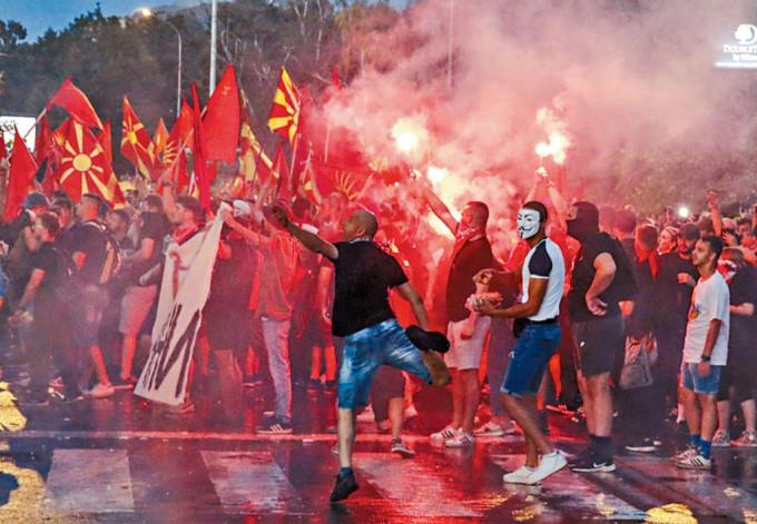 (星島日報報道)歐洲小國北馬其頓連日有民眾示威,抗議政府支持一項為促成國家加入歐盟,而向鄰國保加利亞大舉讓步的妥協方案。警方稱,周二晚在首都斯科普里的國會大樓外有示威者投擲石塊、燃燒彈及其他雜物,更造成了四十七名警察受傷。