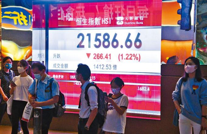 (星島日報報道)英倫銀行行長貝利周二警告,全球經濟前景明顯惡化,令全球經濟衰退風險增加,加上內地疫情再度升溫,A股表現疲軟,上證指數及深成指數齊跌逾1%,恒指昨日低開76點後反覆向下,最多跌逾550點,尾段跌幅收窄,收報21586點,跌266點,成交金額1412億元。有分析認為,恒指近期曾從低位重上22000點,不排除持續調整,短期有機會跌穿21000點,惟投資者毋須恐慌,可觀望內地對待疫情措施等再作部署。亦有分析預期,若恒指短期不能突破22198點,大市或繼續下試低位。