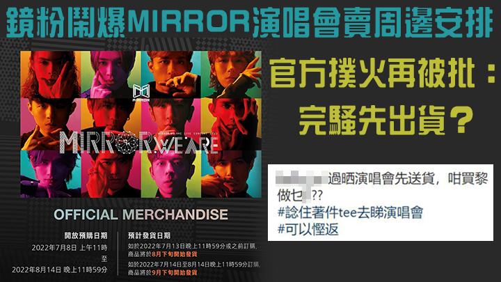 MIRROR將於本月底舉行首個紅館演唱會,昨日(6日)MIRROR的官方社交平台就率先公開演唱會周邊商品,不過就引來鏡粉不滿沒有出應援手燈。而且官方表示今次所有商品將於MOOV Shop率先獨家網上預購,不少早前課金入官方歌迷會的會員對於再次冇得優先訂購大感不滿,亦擔心貨源不足最後又要同黃牛搶。