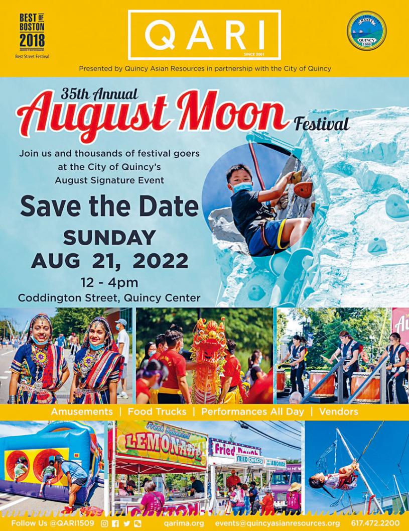 由昆西亞協服務中心(QARI)主辦的第35屆2022年昆西八月中秋節慶祝活動將於8月21日中午12點至下午4點,在位於昆西市中心(Quincy Center)的科丁頓街(Coddington Street)舉行。有關本屆中秋節慶祝活動詳情,可進入網站https://www.qariusa.org了解。