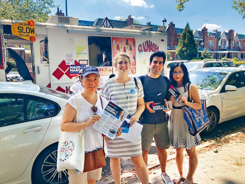 正在競選紐約市第十聯邦眾議員選區的民主黨參選人莫美倫(Maud Maron),23日冒著90度高溫到布碌崙華裔聚居的日落公園8大道拜票,在大道,附近公園等向和華裔民眾握手介紹自己。