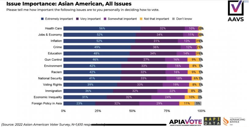 亞太裔投票聯盟(APIAVote)、AAPI 數據、亞美公義促進中心(Asian Americans Advancing Justice)25日發布該份半年度報告,揭示全美亞太裔對於多項社會議題,包括中期選舉、經濟、槍支管制、罪案、教育等諸多議題的看法。該調查於今年4月19日至6月19日展開,訪問了1610名亞太裔註冊選民。