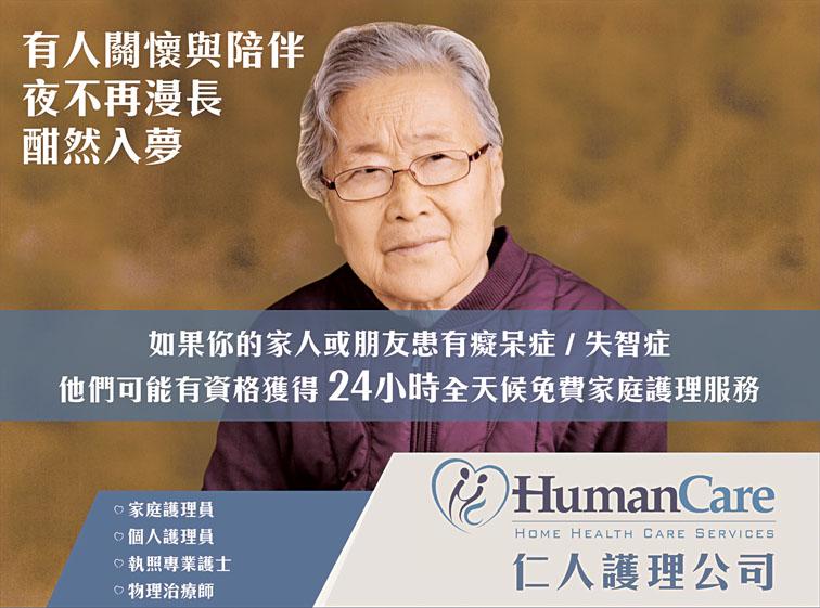 仁人護理公司(Human Care Home Health Care Services)是一所由紐約州衛生局頒發執照的家庭護理機構,仁人護理公司服務區域涵蓋紐約五大區:布碌崙、皇后區、曼哈頓、布朗士、史丹頓島、長島納蘇郡。多年來為無數病患提供優質全面的家庭護理來滿足醫療上和日常生活上的需要,仁人護理公司承諾為被照護者提供專業、愛心和熱誠的家庭健康護理服務,深得社區高度讚譽,有口皆碑。