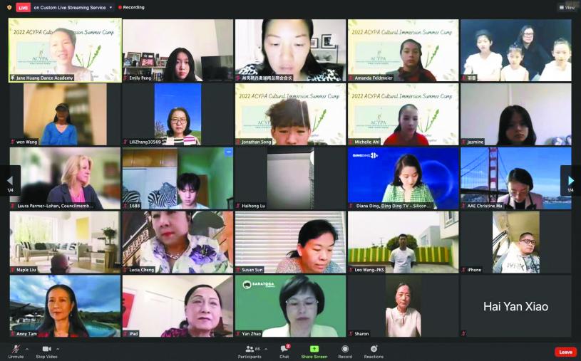 當日來到線上開幕式特邀嘉賓有中華人民共和國駐舊金山總領館教育處領事盧海鴻、San Carlos市議員前市長 Laura Parmer Lohan,(現為聖馬刁郡郡長競選候選人);薩拉托加市市議員前市長趙嬿女士;海外炎黃子孫拜祖大典主席張麗莉女士;矽谷媒體中心的DingDing 電視創始人丁維平女士;San Carlos 社區華人群創始人Laura Jiang 以及來自加拿大的藍絲帶基金會創始人龐燕女士、德國德泰影視傳媒有限公司的王文女士,他們並紛紛做了精彩的演講,贊揚和鼓勵青少年們為社會多做自己應盡的貢獻!JoJo Garden鄒慶紅、資深媒體人錢承飛等媒體也加入了此次活動。在開幕式中再次感謝了所有自願領導這些非營利課程的老師們,他們中的許多人還進行了精彩的豐富文藝演出,其中有美禧卓安自編自導的舞蹈、宋潤聲歌曲演唱、雨潼老師的詩朗誦、王曼達講故事、加拿大6歲小女孩Shirley 演唱京劇、王樂老師的武術、來自中國的小羽毛樂團的中西樂器合並演奏加獨唱的民歌《瀏陽河》、田甜走秀、蕭莉的獨唱以及來自丹麥的小姑娘李肖雅熙用電鋼琴演奏了一曲動聽的丹麥民歌……展示了他們的個人才華及各自的藝術風格。最後,JoJo Zou 為夏令營展開了第一個大師課程,講授如何利用藝術天賦才能進入頂尖大學。下課後她還宣布她將為 ACYPA 基金會提供一筆捐款,將用於幫助有需要的人,以及給該組織未來將舉辦的其他活動。