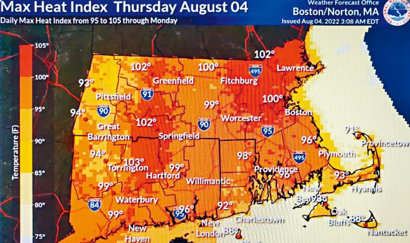 東北地區再次迎來熱浪,4日有超過7000萬人受到高溫警告影響,有效時間可能持續到周末,多個城市氣溫勢將再創新高,例如麻省波士頓預計會衝上華氏99度,比1928年的舊紀錄高3度。