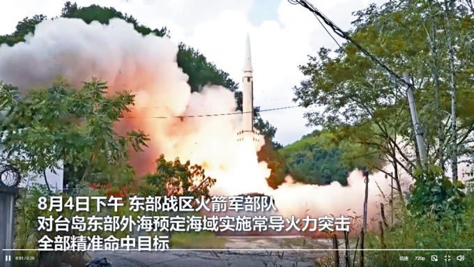 台灣軍方稱,解放軍在昨午一時五十六分至四時,向台灣東北部、西南部周邊海域,發射十一枚東風系列導彈,台軍即時掌握發射動態,啟動相關防禦系統。台媒引述台軍方人士稱,由於解放軍分別從福建北部的寧德,以及福建南部發射導彈,射向台灣東北部及西南部劃定海域,因此導彈並未飛越過台灣本島上空。