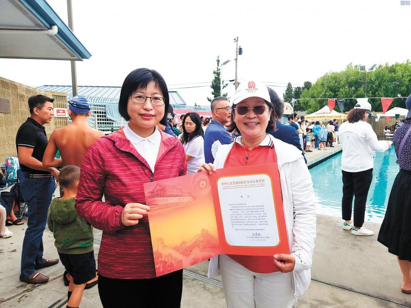 中國駐舊金山副總領事鄒永紅到場祝賀,給華體會頒發了賀狀,鄒永紅表示,游泳比賽是大眾喜聞樂見的活動形式,也是剛好處在孩子都放假的暑假期間,體現了「團結協作、向上拼搏」的體育精神。