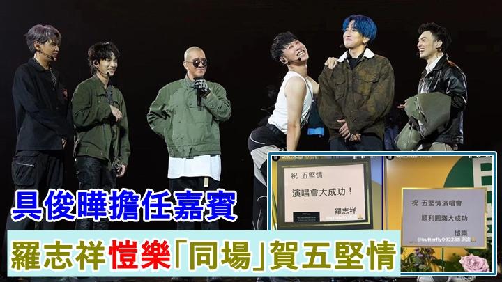 由台星邱鋒澤、陳零九、黃偉晉、婁峻碩及小賴合組的「五堅情」,昨晚(6日)首度在台北小巨蛋舉行《五堅情Moon Landing月面著陸台北小巨蛋演唱會》,與五堅情在《娛樂百分百》合作過的羅志祥(小豬)及愷樂,也有送上花籃祝賀。自小豬被前女友周揚青爆出愛「多人運動」,又點名與愷樂「有不正常男女關係」後,女方一直神隱,今次是二人逾兩年來首度「同場」。