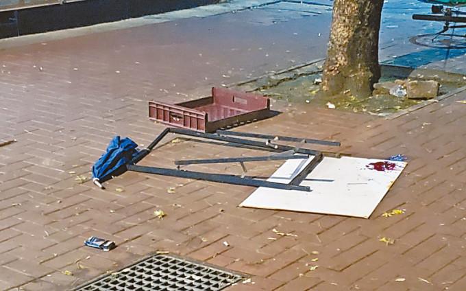 食肆對開滿布雜物,包括數把破爛雨傘及斷開的傘柄,其中一個牌上遺下大攤血迹,警員封鎖調查,並向食肆女店員了解案發經過。警方將案件列作傷人處理,交由屯門警區反黑組跟進,刻正展開進一步調查,並根據附近閉路電視錄影,追緝兇徒歸案。