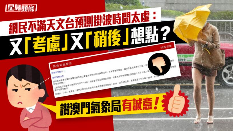 有網民在討論區爆粗留言狂轟天文台:「成日考慮考慮,稍後稍後,幾點就幾點啦,直接少少似返個男人好唔好?」 又上載一張來自澳門地理物理及氣象局的風球預報表截圖,直言「學下人哋澳門天文台,整份表出嚟好X難咩?」