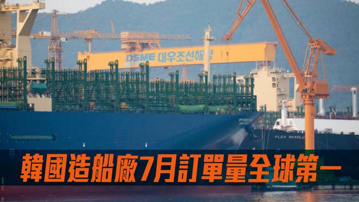 根據全球市場研究機構Clarkson Research的數據,以現代重工(Hyundai Heavy Industries)為首的韓國造船廠,7月共獲得116萬修正總噸(CGT)的新訂單,佔全球210萬CGT總量的55%,穩居世界第一。中國造船廠7月共獲62萬CGT,佔全球總量30%,位居第二。