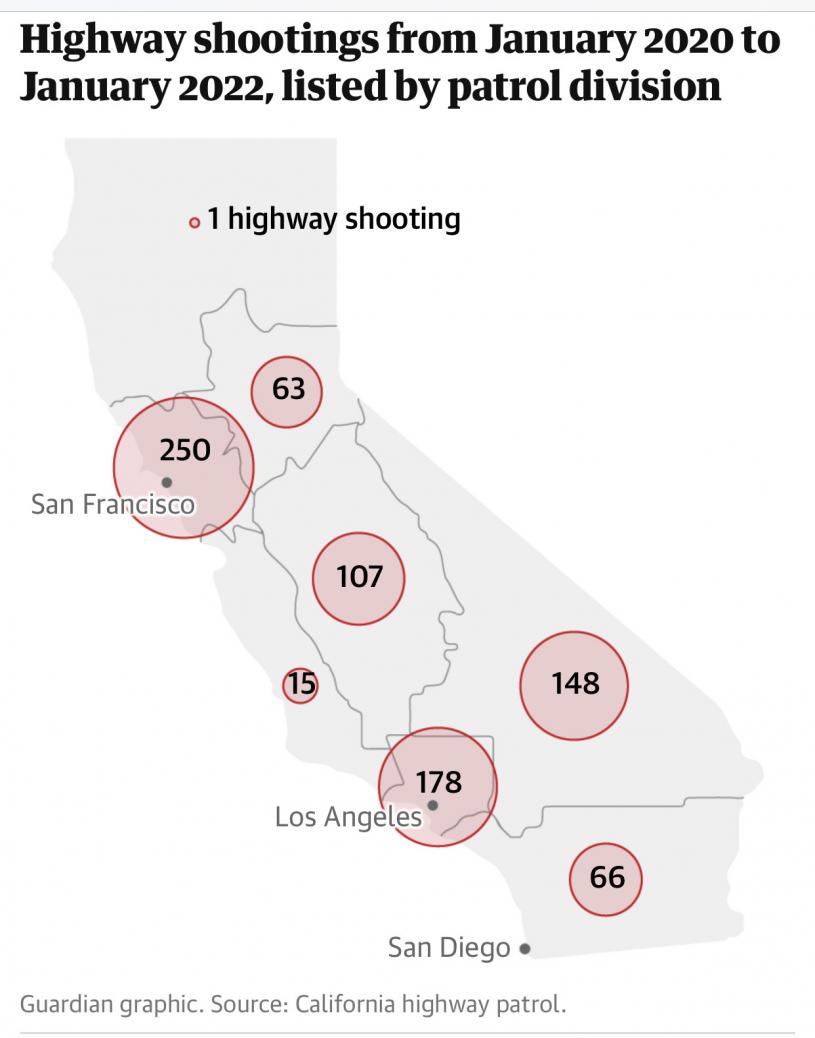 加 州 高速公路巡警隊(CHP:California Highway Patrol)從加州立法分析辦公室(LAO)獲得的數據顯示,在2021年,加州至少發生了411起高速公路槍擊事件,相比2019年的210起,在COVID疫情以來的兩年,加州高速公路槍擊案增加數字幾乎翻了一番。