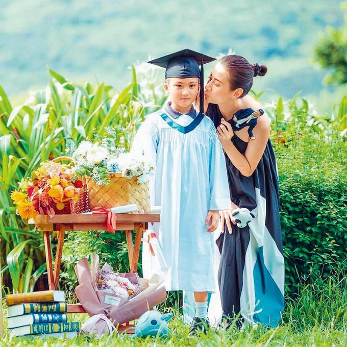 相中見陳真穿上畢業袍,頭戴四方帽,即將入讀小學的他長得非常高大,而Emme則穿上一條露肩黑色長裙,明顯悉心打扮,並向囝囝獻吻,她寫道:「畢業了,感恩這些年都能好好陪着你,#畢業照依然有爸爸,仲有最愛嘅Panda。」好友佘詩曼、鄭希怡等都紛紛留言送上祝賀。