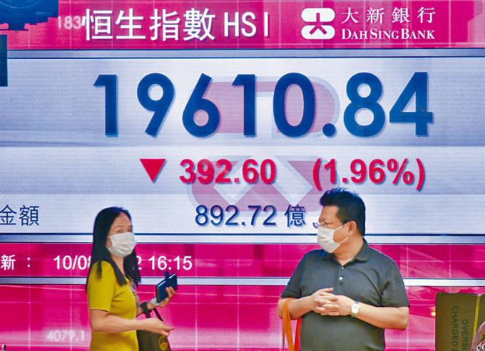 恒指昨日低開47點後,跌幅不斷擴大,最多跌534點,尾段跌幅收窄,收報19610點,跌392點,國指則跌150點,報6644點;科指挫121點,報4173點,成交金額892億元。
