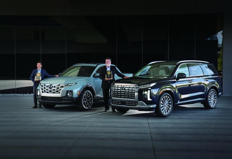 北美現代汽車產品計劃部門資深經理John Shon於2022年七月二十日在加州噴泉谷接受由J.D. Power全球汽車資深總監Robert Mansfield為現代Palisade與Santa Cruz頒發的J.D. Power APEAL獎盃。