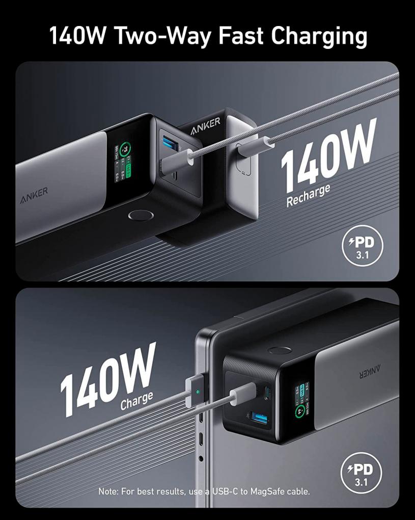 中國公司安克(Anker)推出售價149.99元的PowerCore 24K GaN行動充電器,內有24,000mAh電池讓用家出外使用,不只能以140W快充,還可以輸出同樣功率。假如使用MagSafe至USB-C充電線,這款行動充電器足以在40分鐘內為16吋MacBook Pro手提電腦充電至50%。