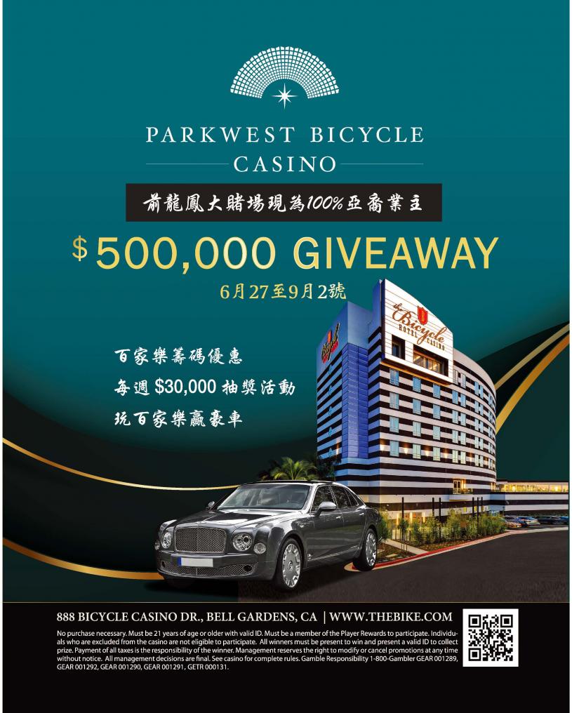 6/27起,推出您最喜愛的賭桌遊戲和50萬元獎品。無抽水,每周抽獎,並有機會贏得賓利豪華汽車。我們就在 Bell Gardens,710高速旁。今天就來Parkwest Bicycle casino試試手氣!