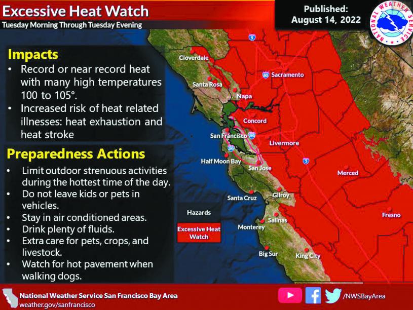 國家氣象服務局周日(14日)凌晨發出中度高溫風險提示,中谷和沙加緬度週邊地區的民眾面對危險酷熱的最高風險。接著於下午發出東灣和中谷等地本周二的酷熱天氣關注,預計東灣會受酷熱影響,沿岸地區氣溫則相對溫和。