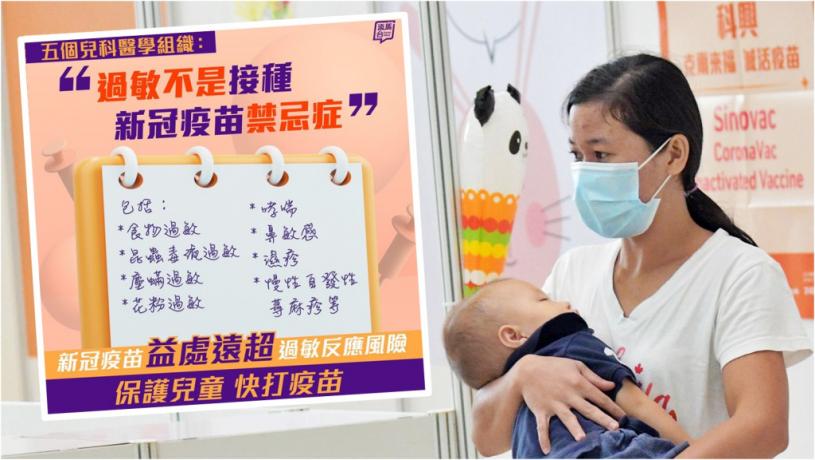 港府指出,5個兒科醫學組織發出聯合聲明,指多種兒童和青少年可能有的過敏反應並非接種新冠疫苗的禁忌症,打針前亦無需轉介過敏科醫生進行評估。
