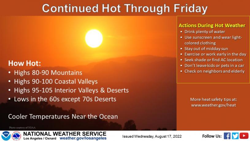 西拉德表示,聖弗南度谷週五氣溫將維持在90度和一百度之間。氣象局數據顯示,伍蘭德山週二時最高氣溫達到104度,週三起逐步降溫。