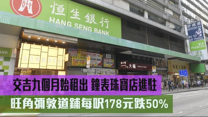 受疫情等因素打擊,核心區鋪位租金持續下滑。消息指,由外號「麻將館大王」石鑑輝家族持有的旺角彌敦道「珠寶段」好望角大廈地鋪,於交吉約9個月後,新獲鐘錶珠寶店以約35萬承租,呎租約178元,較舊租金急挫5成,租金亦重回當年「沙士價」水平;據業內人士指出,現今零售市道仍然疲弱,旺角區內一綫街道更是吉鋪處處,料區內鋪位租金持續調整。