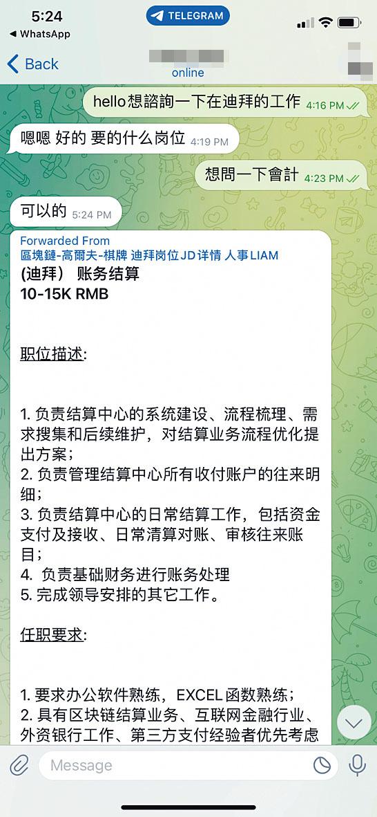 記者隨後成功以WhatsApp聯絡聲稱招聘港人往杜拜的人士,發現手法與近日被傳媒曝光的人口販賣案「收豬仔」手法類似。訊息對話期間,記者假裝對會計工作有興趣,對方表示僱主是一家博彩公司,主要負責結算中心的系統建設、收付帳戶往來明細等,又指該家公司為綫上棋牌遊戲平台團隊,位於馬卡提與杜拜,是亞太地區排名前三的棋牌公司,強調會為員工提供單人居住宿舍,以及不會「禁足」員工,也不會扣押員工護照,更可在宿舍遠程辦公,不去大樓,又承諾報銷前往杜拜的機票。據悉,騙徒不排除成功游說港人後,中途更改「工作計畫」,要求前往泰國等東南亞國家。