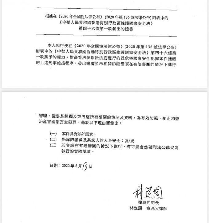 律政司回覆傳媒查詢時表示,「律政司司長會按《香港國安法》相關法律和每宗案件的個別情況,考慮是否根據《香港國安法》第四十六條發出證書,指示相關訴訟毋須在有陪審團的情況下進行審理;而有關條文訂明由三名法官組成審判庭的安排,目的正是要確保公平審訊,秉行司法公義,絕無減損被告人的任何合法權益。律政司不會評論正在進行司法程序的個別案件。」