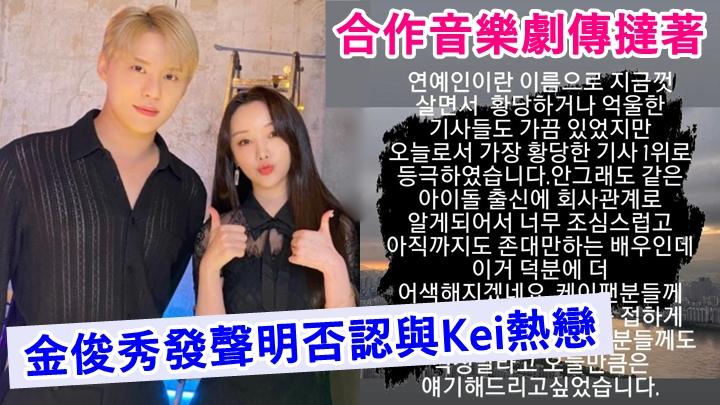 韓團JYJ的35歲成員金俊秀昨日(19日)被爆戀上27歲同門師妹Lovelyz成員Kei,據韓媒《mydaily》報道,多位相關人士透露金俊秀正跟年輕9歲的Kei熱戀中,二人因屬一公司,正在談社內戀愛,也是彼此的支柱,正小心翼翼守護着戀情。不過公司PALMTREE ISLAND隨即發聲明否認:「二人只是公司代表與旗下藝人,亦是同業界的前後輩,金俊秀和Kei的熱戀傳聞完全沒有事實根據。」