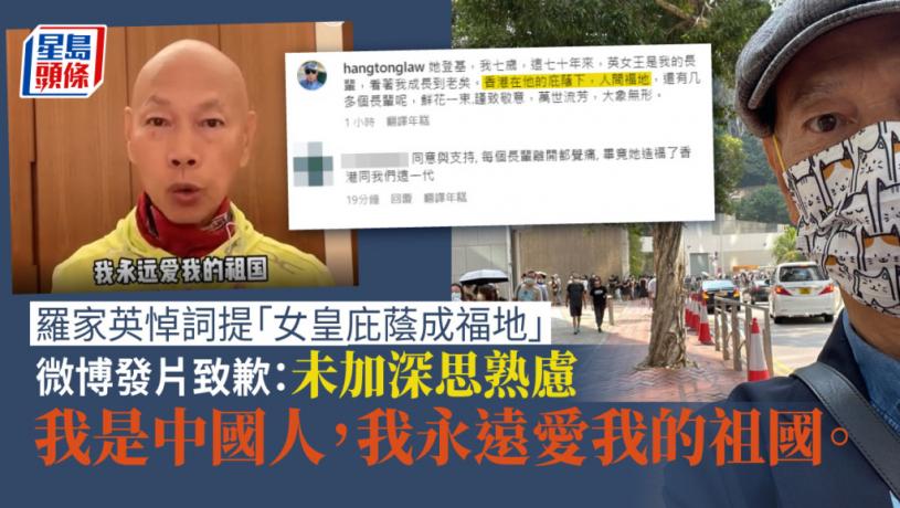 連日來不少港人到英國駐港澳總領事館哀悼已故英女皇伊利沙伯二世。資深藝人、現年75歲的羅家英日前亦有現身獻花,並在網上發表悼詞,然而引來網民的爭議。羅家英今日在微博上為所發表的「香港在女皇庇蔭下成福地」悼詞致歉。