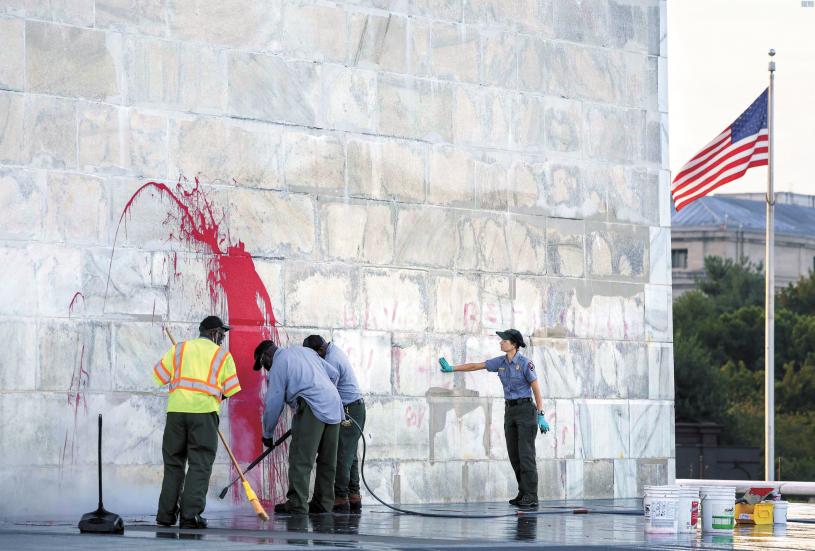 首都華盛頓的著名地標華盛頓紀念碑 (Washington Monument)被人蓄意破壞,基座除了被潑紅油外,還留下侮辱字句。警方其後捕獲1名來自印第安納州的男子,他被控以非法闖入禁制區域,以及篡改和破壞公物的罪名。事發後,國家公園管理局(National Park Service)已派人著手清理。