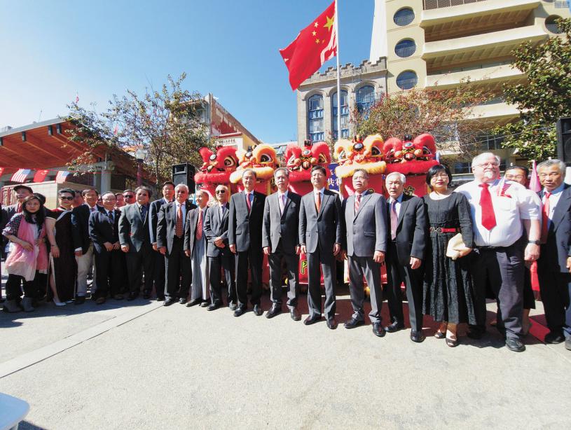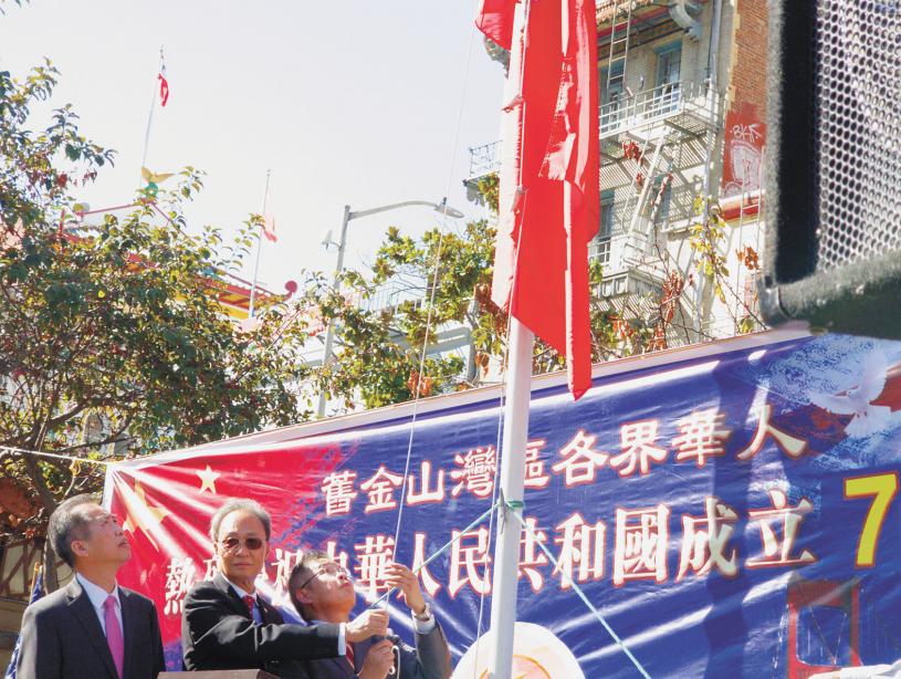 中國73周年國慶將至,由灣區國慶委員會、華商總會、駐美中華總會館等超過20多位僑社共同策劃的升旗慶祝儀式,昨日早上11時在三藩市華埠花園角舉行,三位升旗手分別為駐美中華總會館總董黃中華、灣區中國統一促進會會長關家澄、美國華商總會副會長孫志中。駐舊金山總領事張建敏、副總領事鄒永紅、統促會池洪湖理事長、星島美西版社長兼總編輯梁建鋒等出席。