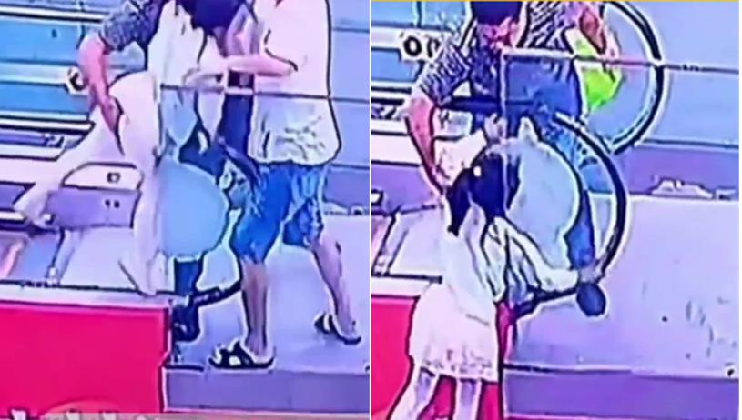 從閉路電視畫面顯示,一名女童雙手攀在扶手電梯扶手處,隨着扶梯上升,雙腿懸空。之後被卡在扶手電梯與一面玻璃的夾縫處,情況十分危急。這時,兩名男子見狀,一同上前將女童解救下來。
