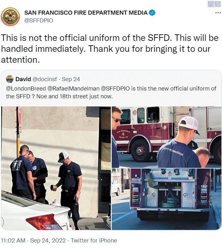 市消防局同日回應推文稱:「這不是三藩市消防局的官方制服,已即時處理事件」。