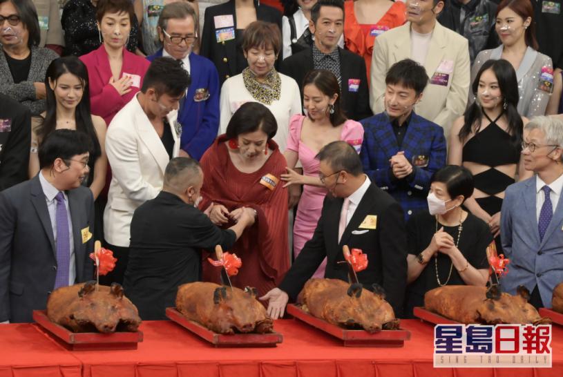 TVB踏入55周年,今日在電視城舉行台慶亮燈暨記者會,公佈連串賀台慶節目。一眾藝員大合照後,現場準備了10隻燒豬,以及55隻足金金豬予有份出席台慶亮燈儀式的台前幕後抽獎,分享開心時刻。