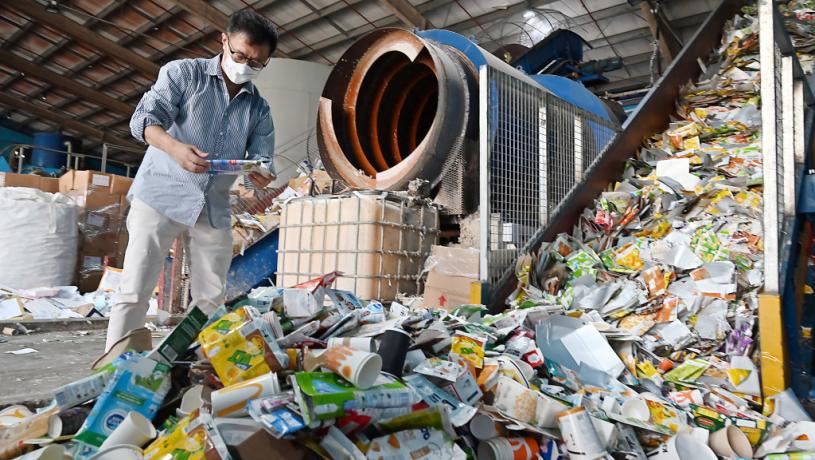 全港唯一紙包飲品盒回收廠「喵坊Mil Mill」。資料圖片