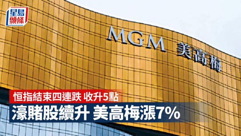 濠賭股續升,新濠國際(200)升9.2%,報6.55元;美高梅中國(2282)升7%,報4.58元;永利澳門(1128)漲5.3%,報5.39元;澳博(880)升4%,報3.11元;金沙中國(1928)升3.2%,報21.05元。