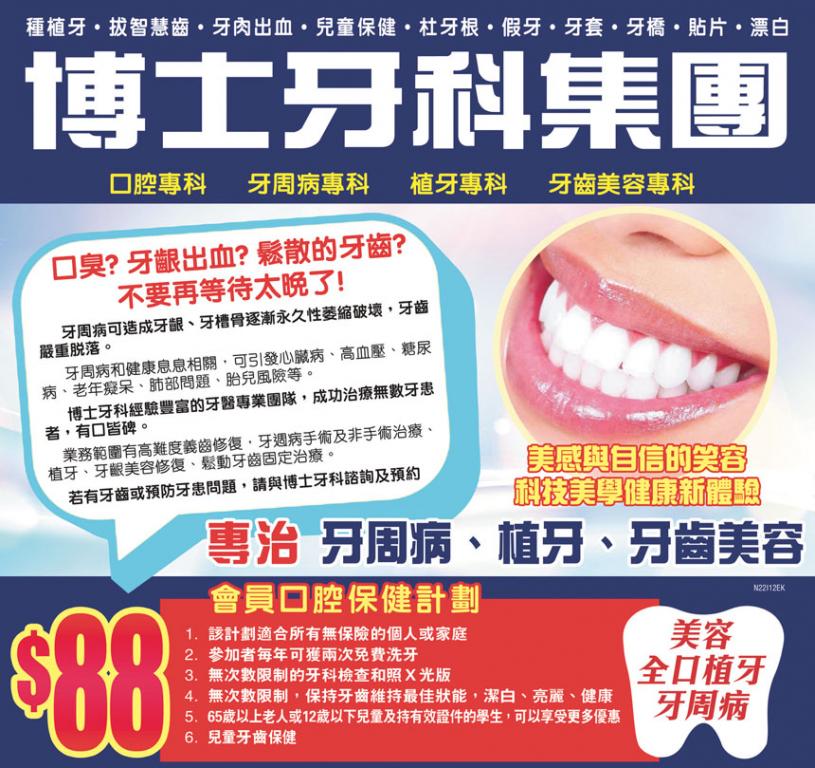 博士牙科集團各大專科,為顧客提供綜合普通科和專科牙科服務,擁有最强大的牙科團隊為你定做一個健康亮麗的笑容。博士牙科服務範圍:口腔專科、牙周病專科、植牙專科、牙齒美容專科。包括:種植牙、拔智慧齒、牙齦出血、杜牙根、假牙、牙套、牙橋、貼片、漂白等。