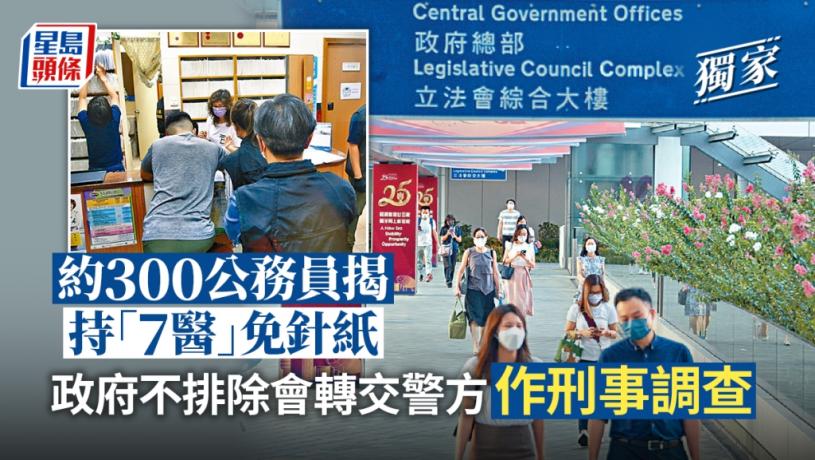 近日先後有七名私家醫生涉嫌濫發俗稱「免針紙」的新冠疫苗接種醫學豁免證明書被捕,政府早前宣布逾二萬張涉事的免針紙將於下月十二日失效。《星島》獲得三個來自政府內部的消息透露,在八百五十名持有免針紙的公務員中,約有二、三百人持有由上述七名醫生所發出的免針紙,據了解政府內部十分重視事件,認為要嚴肅處理,甚至不排除會轉交警方作刑事調查。公務員工會聯合會總幹事梁籌庭表示,若有公務員因行使虛假文書而被定罪及判刑,政府有權處罰員工,最高刑罰是作出解僱,但他認為,要查明該免針紙屬虛假,會有一定難度。