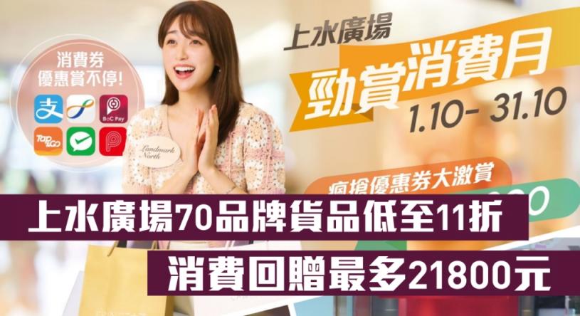 新地旗下上水廣場推出消費券優惠,由10月1日至10月31日,「勁賞消費月」共推出3重消費禮遇,包括「盡享消費券 Jetso Rewards」、「秋日狂賞 Autumn Rewards」及「NEW TASTES 味‧嚐新」,只要透過6大電子支付平台到場消費回贈最高超過24300元,讓消費券賞上加賞。同一時間,場內70間品牌亦攜手推出至抵優惠,精選貨品低至11折發售。