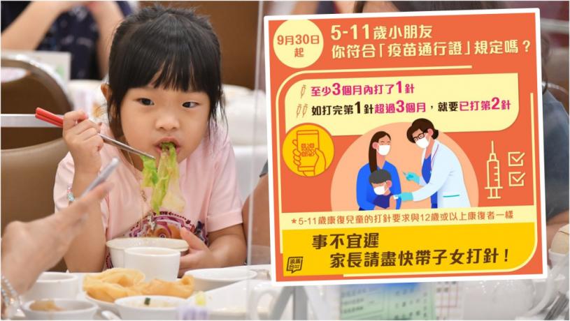 本港的「疫苗通行證」適用年齡由今日(30日)起降至5歲。5至11歲兒童進入任何「疫苗通行證」適用處所,包括食肆堂食,均須符合「疫苗通行證」下訂明的接種要求,即接種兩劑新冠疫苗,或接種第一劑新冠疫苗後未滿3個月。到11月30日起,5至11歲兒童的「疫苗通行證」接種要求會統一為須已接種第2劑疫苗。