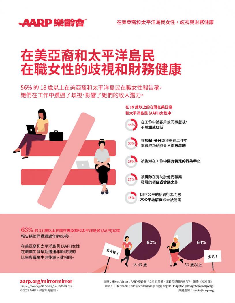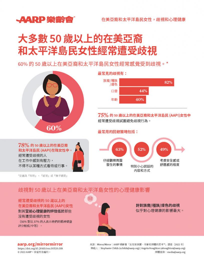 AARP 樂齡會公布了其Mirror/Mirror年度調查的最新結果:女性對美麗、年齡和媒體的思考。該研究表明,60%的50歲以上在美亞裔和太平洋島民(AAPI)女性「至少有時」會遭受歧視。