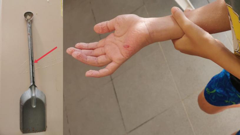 港九拯溺員工會表示,今日下午5時半,一名8歲男童與家人到泳灘玩樂,並帶金屬鑊鏟掘沙,由於男童皮膚幼嫩,而且被海水浸軟,一下用力過度導致手掌皮肉不小心被鑊鏟鐵縫夾住,進退兩難。