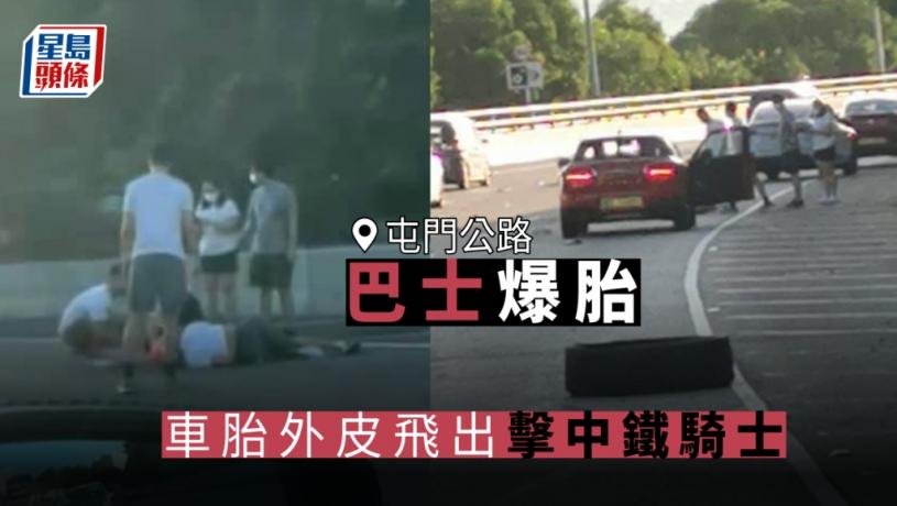 下午5時許,一輛巴士及一輛電單車沿屯門公路往屯門方向行駛,當駛至近屯門公路轉車站時,巴士右尾輪胎懷疑爆胎,外皮飛出擊中電單車。