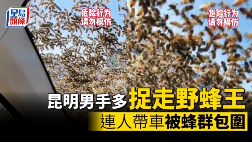 雲南昆明一名男子昨日手多擅自拿走「野蜂王」,結果汽車車窗上趴滿蜜蜂被追趕一段路程。