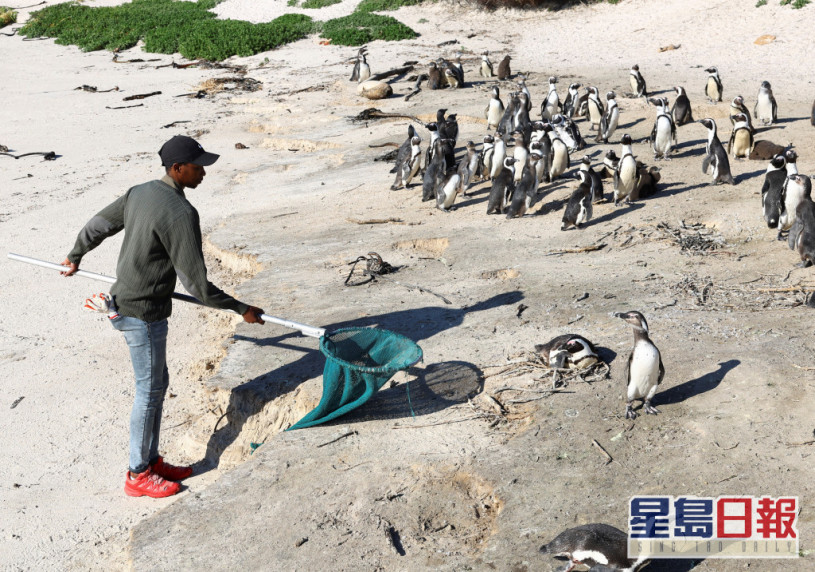 南非國家公園的一名護理員在企鵝棲息地監測一群非洲企鵝。路透社圖片